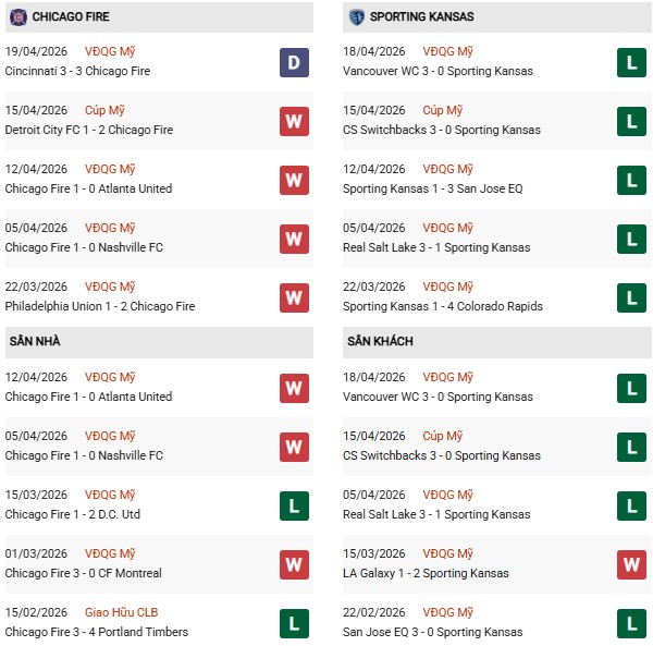 Thống kê phong độ Chicago Fire vs Kansas City: