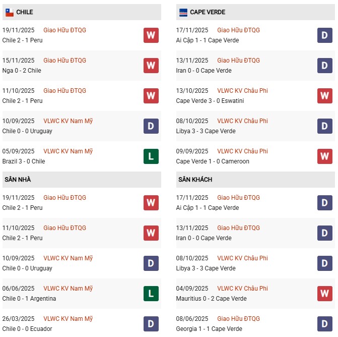 Thống kê đối đầu Chile vs Cape Verde: