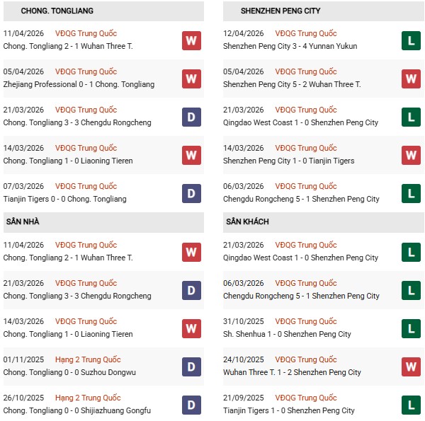 Thống kê phong độ Chongqing Tonglianglong vs Shenzhen: