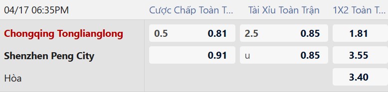 Thông tin tỷ lệ Chongqing Tonglianglong vs Shenzhen: