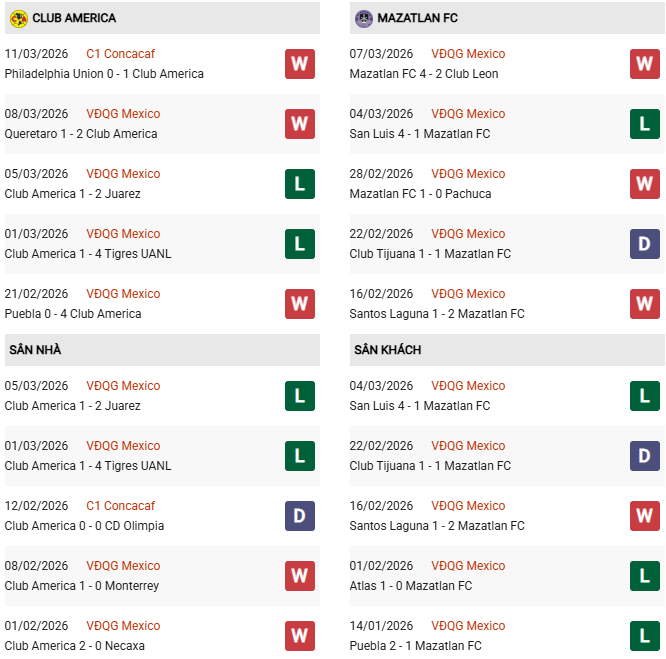 - Trên sân nhà, Club America thắng 4, hòa 1 trước Mazatlan.