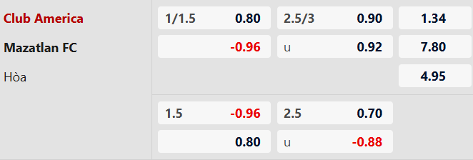 Thông tin tỷ lệ cược Club America vs Mazatlan: