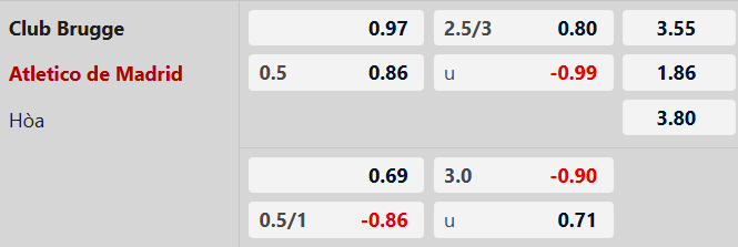 Thông tin tỷ lệ kèo bóng đá Club Brugge vs Atletico Madrid:
