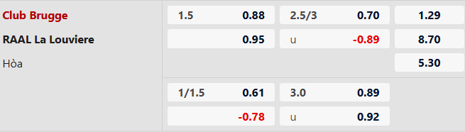 Club Brugge chấp 1 1/2 bàn cả trận. Thống kê được đưa ra, Club Brugge thắng La Louviere 6/8 trận đã qua, còn lại là 1 trận hòa và 1 trận thua. Với lợi thế sân nhà, Club Brugge được cho sẽ có chiến thắng và kèo châu Á thành công.