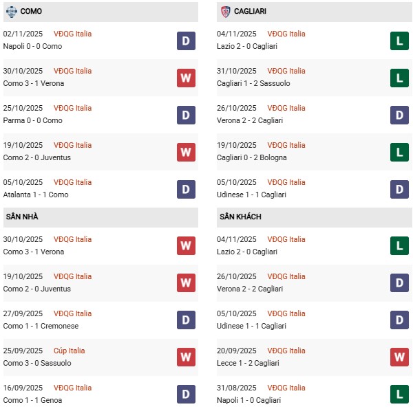- Trên sân nhà, Como thắng 1, thua 1 trước Cagliari.