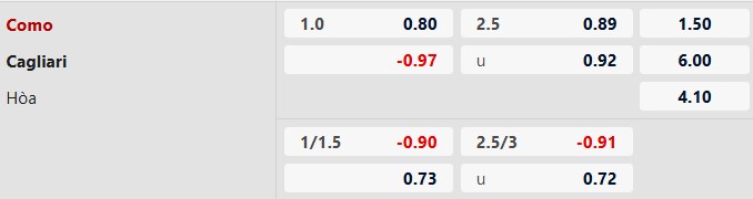 Como ngày càng hoàn thiện về khía cạnh tập thể dù các ngôi sao lớn tuổi của họ không đóng góp được quá nhiều. Como không những đủ khả năng giành 3 điểm mà còn có thể thắng áp đảo. Bên cạnh đó, Como thắng theo châu Á 8/11 trận chính thức gần đây trên sân nhà. Cagliari thua theo châu Á 3/4 trận Serie A vừa qua. Việc Como nhường tới 1 bàn thắng là khá sâu, báo hiệu sự áp đảo của thầy trò Fabregas, Como sẽ giành 3 điểm và thêm chút may mắn họ có thể thắng theo châu Á.