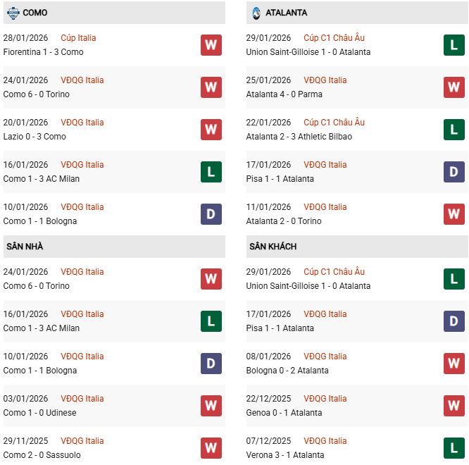 - Como thắng 1, hòa 2, thua 5 trong 8 trận gặp Atalanta gần đây.