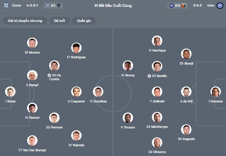 Đội hình dự kiến Como vs Inter Milan: