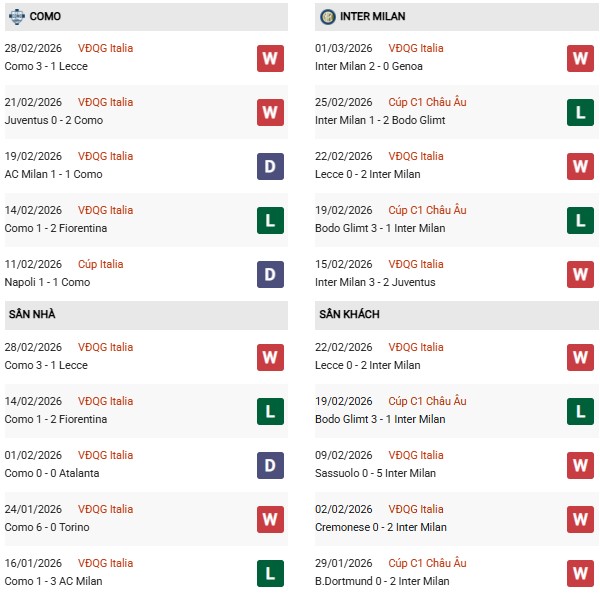 Thống kê phong độ Como vs Inter Milan: