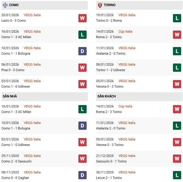 - Trên sân nhà, Como thắng 2, thua 2 trước Torino.