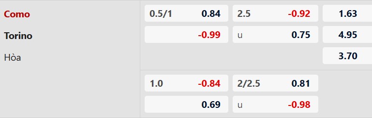 - Como thắng 3, hòa 1, thua 4 trong 8 trận gặp Torino gần đây.