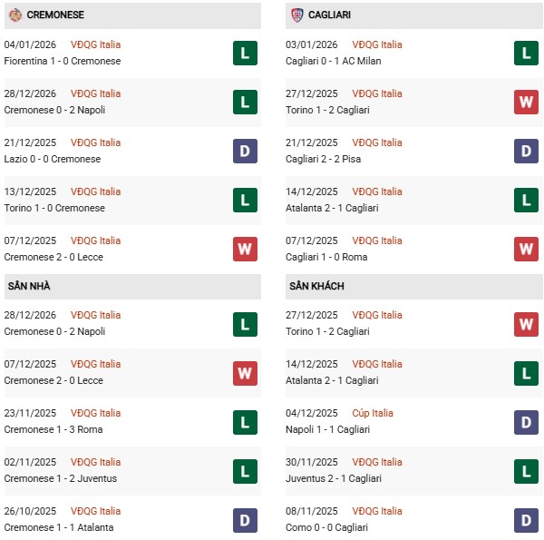 - Cremonense toàn thua cả 3 trận đối đầu Cagliari gần đây.