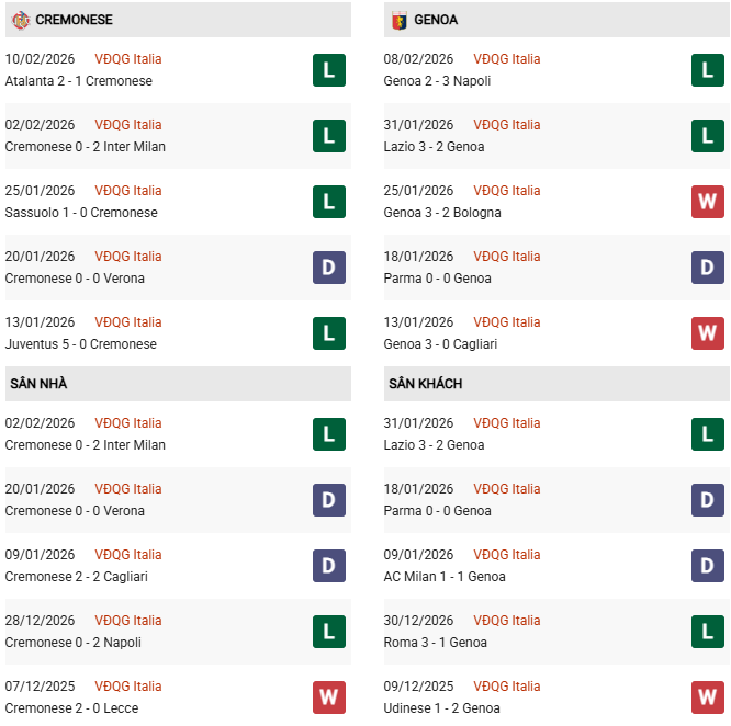 - Cremonese thắng 1, hòa 1, thua 1 trong 3 trận gặp Genoa gần đây.