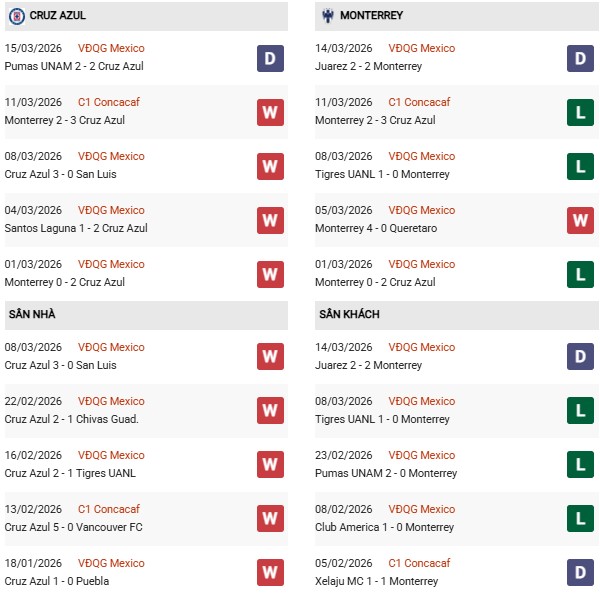 Thống kê phong độ Cruz Azul vs Monterrey: