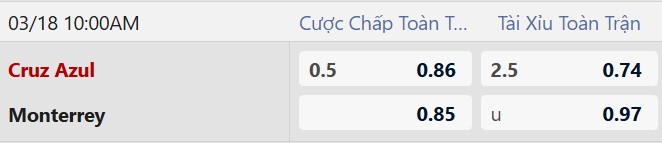 Thông tin tỷ lệ cược Cruz Azul vs Monterrey: