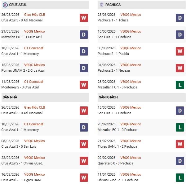 Thống kê phong độ Cruz Azul vs Pachuca: