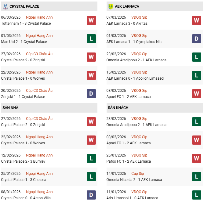 Thống kê đối đầu Crystal Palace vs AEK Larnaca: