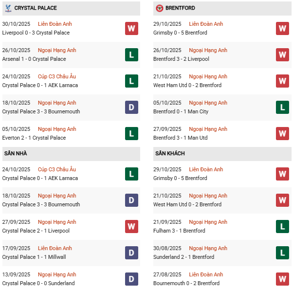 - Trên sân nhà, Crystal Palace thắng 1, thua 1 trước Brentford.
