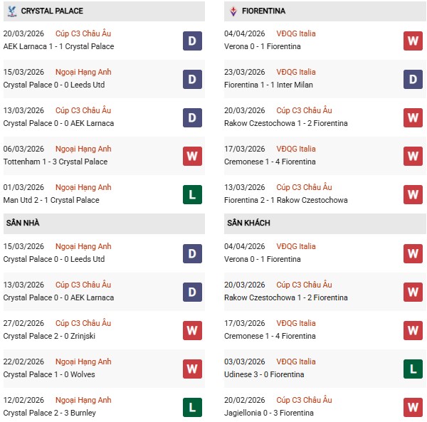 Tuy nhiên, đá sân khách tại Anh luôn là thử thách không dễ. Dù Fiorentina có phong độ tốt, Crystal Palace lại sở hữu nền tảng thể lực mạnh cùng ưu thế sân bãi. Đây nhiều khả năng sẽ là trận đấu mà đại diện Premier League chủ động dâng cao tìm lợi thế trước trận lượt về.