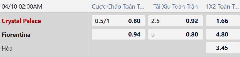 Thông tin tỷ lệ kèo bóng đá Crystal Palace vs Fiorentina: