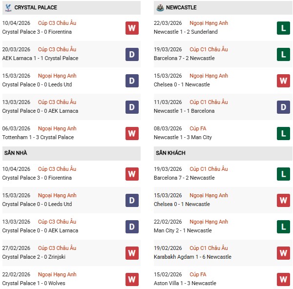 Thống kê phong độ Crystal Palace vs Newcastle: