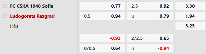 Thông tin tỷ lệ kèo CSKA 1948 Sofia vs Ludogorets: