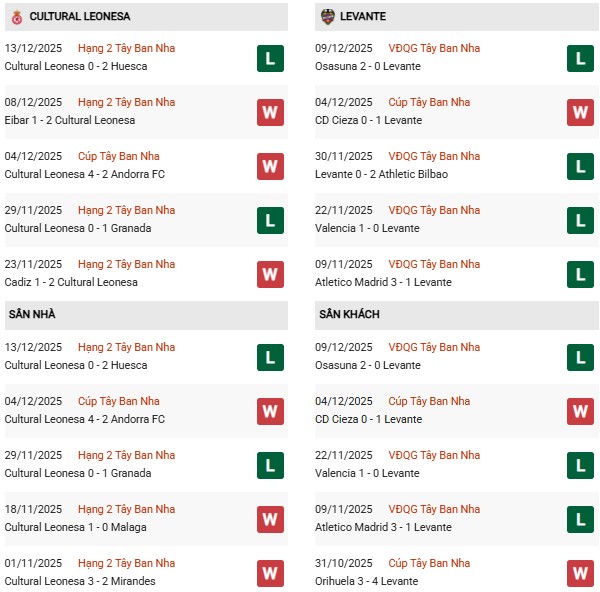 Thống kê phong độ Cultural Leonesa vs Levante: