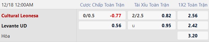 Thông tin tỷ lệ kèo Cultural Leonesa vs Levante: