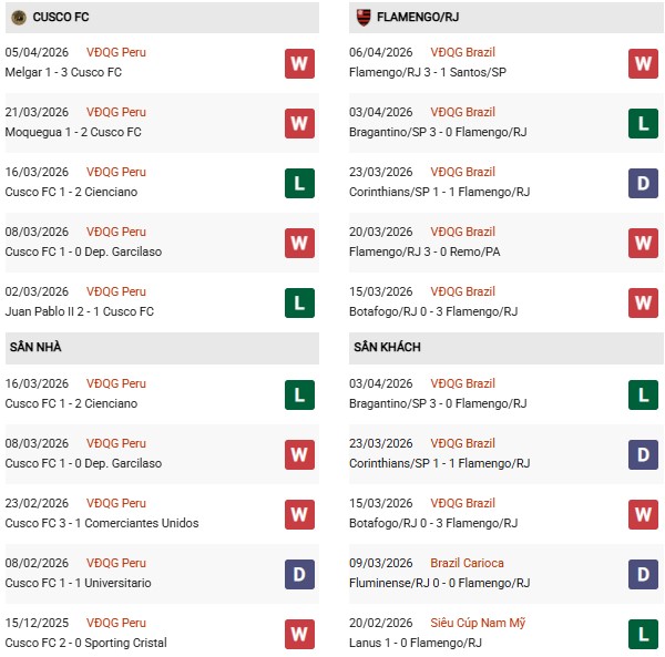 Thống kê phong độ Cusco vs Flamengo: