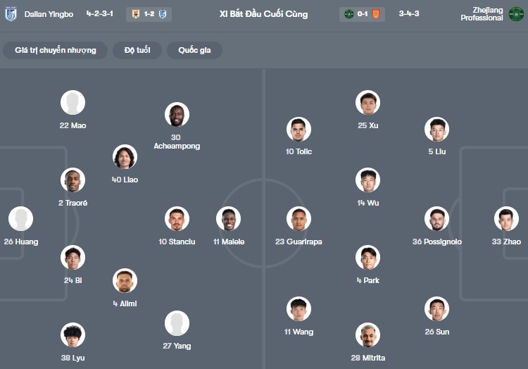 Đội hình dự kiến Dalian Yingbo vs Zhejiang: