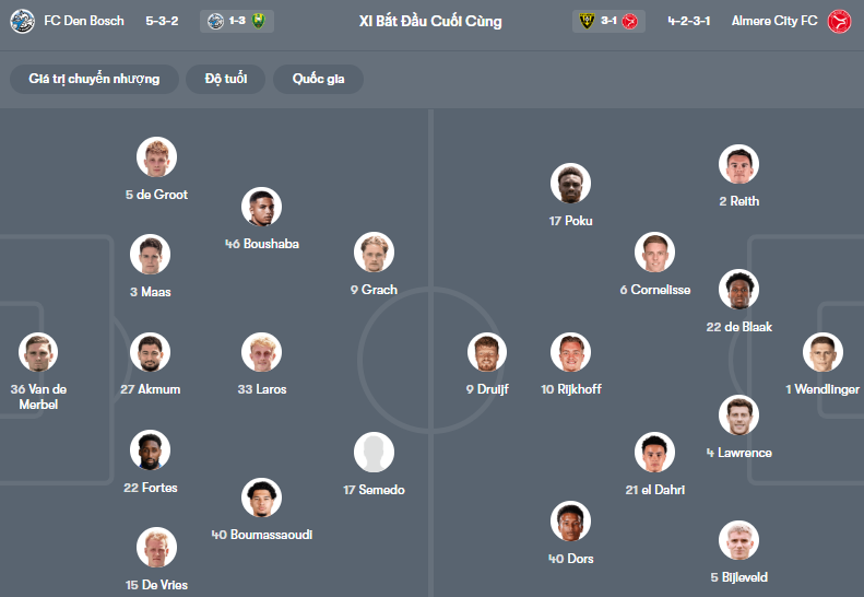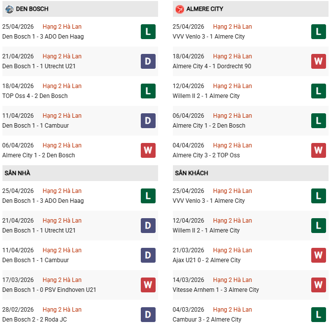 - Trên sân nhà, Den Bosch thắng 2, thua 5 trước Almere City.
