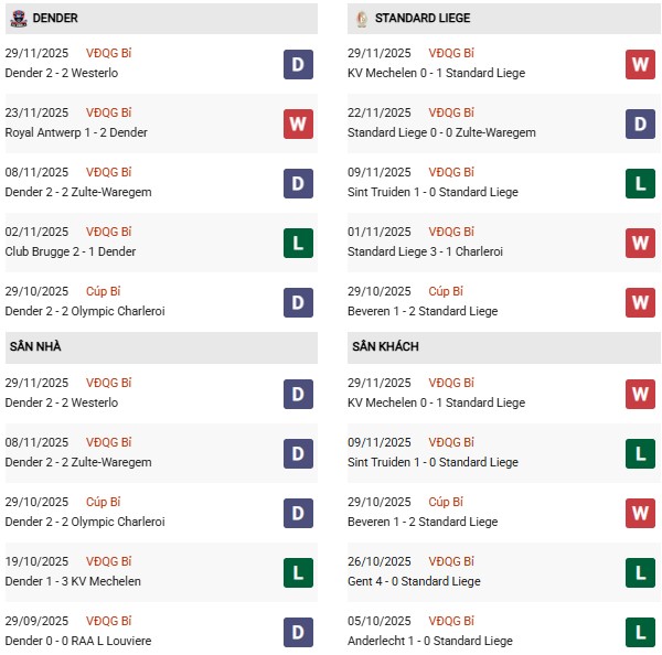 - Dender thắng 1, hòa 3, thua 6 trong 10 trận gặp Standard Liege gần đây.