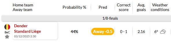 Standard Liege vẫn đang trong quá trình tìm lại hình ảnh của đội bóng lớn. Họ thi đấu thiếu ổn định nhưng vẫn có những thời điểm chơi tốt với 5 thắng, 1 hòa, 4 thua trong 10 trận gần nhất. Đội bóng này sở hữu lối chơi kiểm soát và khả năng tấn công đồng bộ hơn Dender, nhưng vấn đề nằm ở sự thiếu bùng nổ và đôi khi mất tập trung ở tuyến phòng ngự.