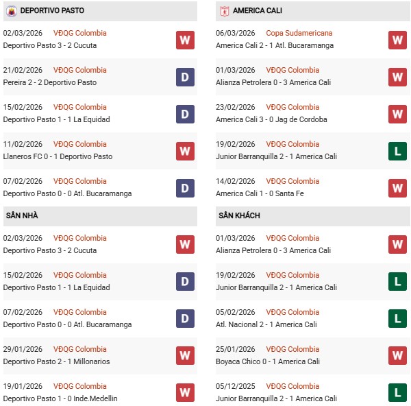 Phong độ của América de Cali cũng khá ổn định với 6 chiến thắng, 2 trận hòa và 2 thất bại trong 10 trận gần nhất trên mọi đấu trường. Tuy nhiên, thành tích sân khách lại không thật sự thuyết phục khi họ thắng 3, hòa 1 và thua tới 6 trong 10 chuyến xa nhà gần đây. Đây có thể là yếu tố khiến đội bóng này gặp nhiều khó khăn khi hành quân tới sân của Pasto.
