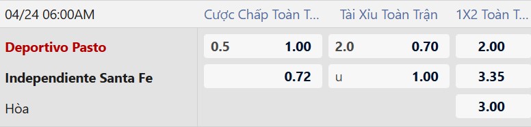 Thông tin tỷ lệ cược Deportivo Pasto vs Santa Fe: