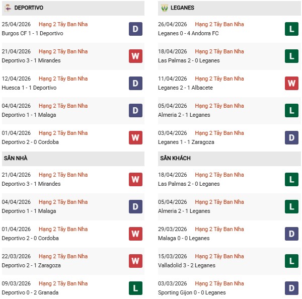 - Trên sân nhà, Deportivo thắng 1, thua 2 trước Leganes.