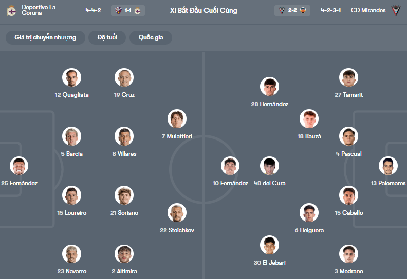 Phía bên kia chiến tuyến, Mirandes lại đang chìm sâu trong khủng hoảng với vị trí áp chót trên bảng xếp hạng với 33 điểm. Dù vừa có trận hòa đầy nỗ lực 2-2 trước Castellon, nhưng nhìn chung phong độ của Mirandes vẫn rất phập phù.