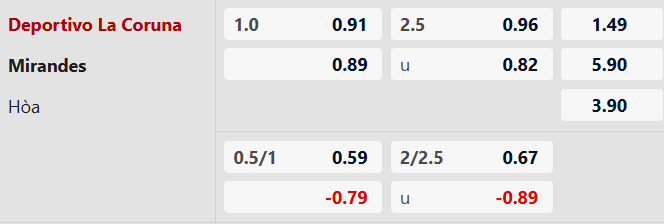 Mức chấp 1 bàn phản ánh sự áp đảo hoàn toàn của Deportivo so với đối thủ. Với phong độ thăng hoa và lợi thế sân bãi, Deportivo được kỳ vọng sẽ tạo ra một thế trận áp đặt ngay từ đầu. Hàng công của đội chủ nhà đang vận hành trơn tru trong khi hàng thủ Mirandes lại quá mong manh. Việc Deportivo giành một chiến thắng cách biệt để củng cố vị trí trong nhóm thăng hạng là kịch bản rất dễ xảy ra.