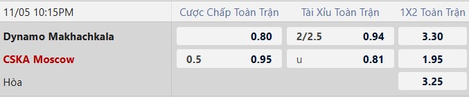 Thông tin tỷ lệ cược Dinamo Makhachkala vs CSKA Moscow:
