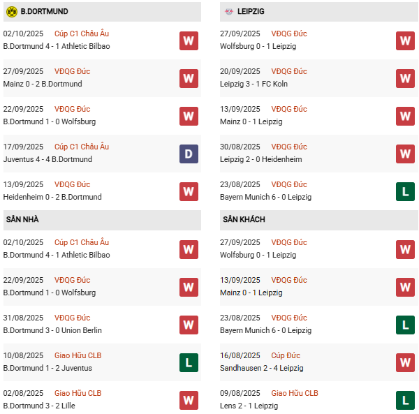 Thống kê phong độ Dortmund vs RB Leipzig: