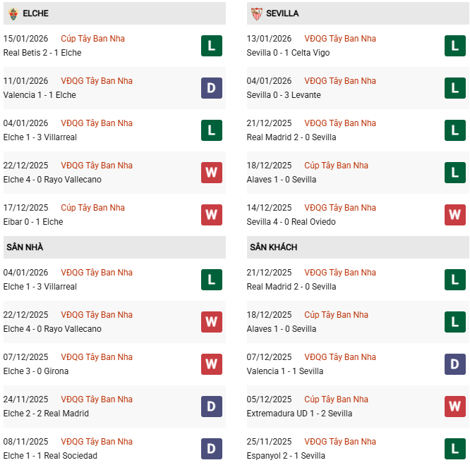 - Trên sân nhà, Elche thắng 1, thua 1 trước Sevilla.