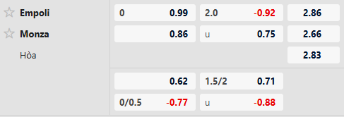 Thông tin tỷ lệ kèo Empoli vs Monza: