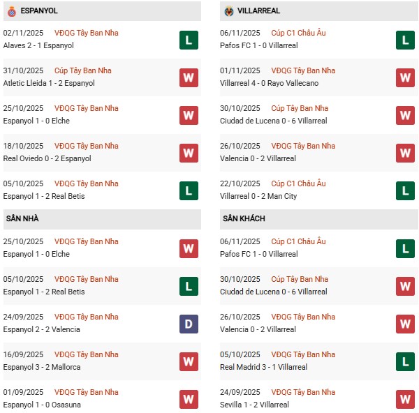 Thống kê phong độ Espanyol đấu với Villarreal: