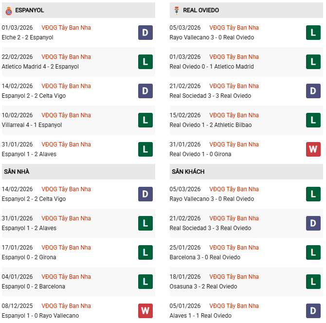 - Espanyol thắng 3 thua 2 trong 5 trận đối đầu vừa qua trước Oviedo.