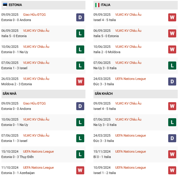 - Estonia thua cả 4 trận đối đầu Italia gần đây.