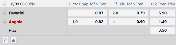 Eswatini chỉ mới có cho mình được vỏn vẹn 4 bàn sau 7 trận trong khi Angola cũng chẳng khá hơn với 7 pha lập công. Toàn bộ 4 cuộc chạm mặt liên tiếp giữa hai đội cũng đều về Xỉu với không quá 2 lần lưới rung sau 90 phút. Dù tỷ lệ tài xỉu 2 hòa là rất nhẹ nhàng thế nhưng khả năng rất cao kèo đấu này vẫn sẽ về Xỉu chung cuộc sau 90 phút.