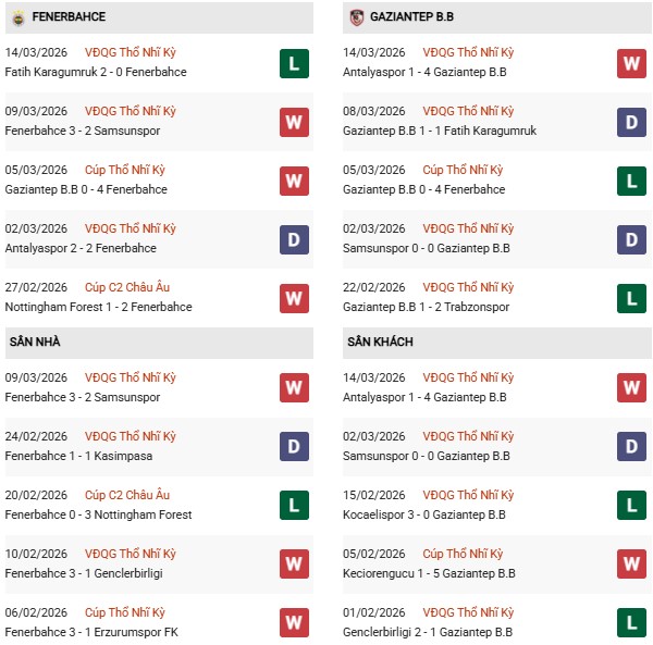 Thành tích đối đầu Fenerbahce vs Gaziantep: