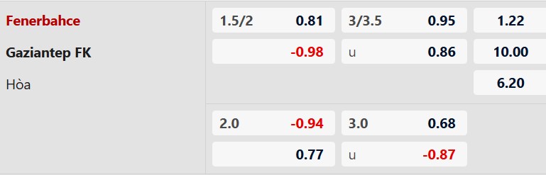 Thông tin tỷ lệ cược Fenerbahce vs Gaziantep: