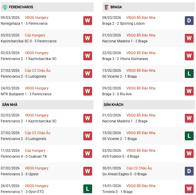 Tối thiểu 3 bàn: 6/8 trận gần đây của Ferencvaros đều có tối thiểu 3 bàn. 6 trận vừa qua của Braga số lần lưới rung cũng đều cao hơn mức 3.