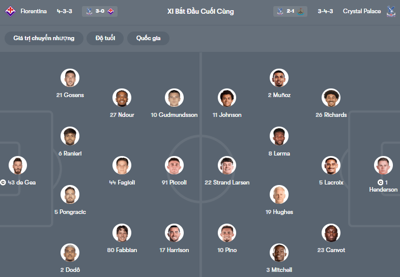 Đội hình dự kiến Fiorentina vs Crystal Palace: